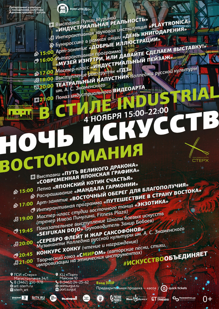 Акция «Ночь искусств» традиционно проходит под девизом «Искусство объединяет». Галерея «Стерх» представит уникальную программу «Востокомания» - это выставки «Современная японская графика» и «Путь великого дракона», возможность принять участие в арт-занятиях по раскрашиванию мандалы гармонии, изготовление традиционных восточных талисманов и оберегов, лепка японского котика счастья, а также мастер-класс от студии восточного танца «Экзотика» и показательное выступление Школы боевых искусств Seifukan Dojo. Культурный центр «Порт» впечатлит программой «В стиле industrial». Индустриальная реальность объединит графические серии работ томской художницы Лукии Муриной, мастер-класс Елены Буловой «Индустриальный пейзаж» и интерактивную музыкальную инсталляцию «Playtronica». Для детей будет интересно порисовать добрые иллюстрации. Эксклюзивом программы будет выступление сургутской рок-группы «ГДЗ» и театральный капустник от колледжа русской культуры им.А.С.Знаменского. Завершит программу показ индустриального видеоарта. Внимание - обе площадки будут работать параллельно. Стоимость посещения – 300 рублей Без возрастных ограничений |