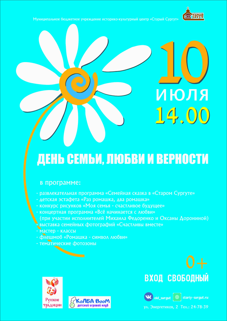 В программе: концертная программа «Всё начинается с любви»; - детская программа «Раз ромашка, Два ромашка»; - конкурс рисунков «Моя семья счастливое будущее»; - выставка семейных фотографий «Счастливы вместе»; - мастер – класс «Своими руками подарки папе и маме»; - флэшмоб «Ромашка символ любви»; - тематические фотозоны и др. Возрастная категория: 0+ Бесплатно |