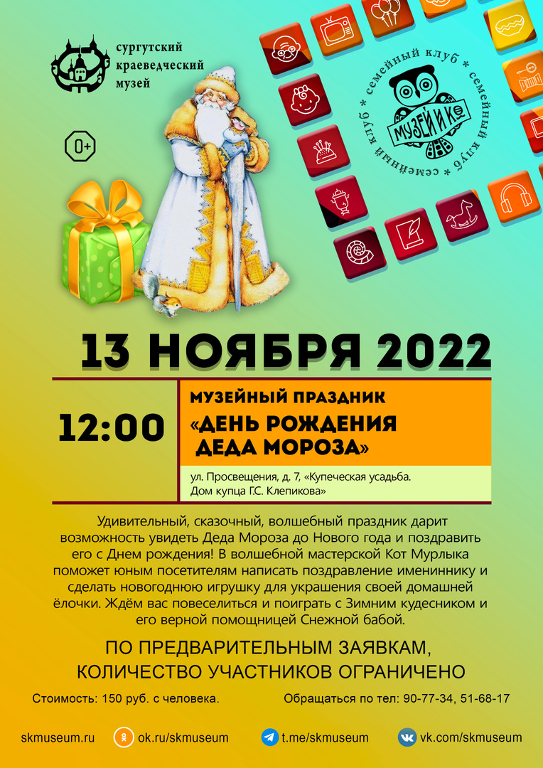 Семейный клуб «Музей и Ко» приглашает на музейный праздник «День рождения Деда Мороза». Участников ждет праздник, который подарит возможность увидеть Деда Мороза до Нового года и поздравить его с Днем рождения. Юные посетители смогут написать поздравление имениннику и сделать новогоднюю игрушку для украшения своей домашней ёлки. По предварительной записи по тел. – 90-77-34 |