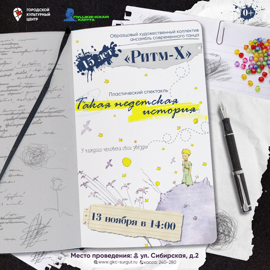 В рамках своего 15-летнего юбилея Образцовый художественный коллектив ансамбль современного танца «Ритм-X» представит зрителям пластический спектакль «Такая недетская история». Участники детского коллектива расскажут недетскую историю о Маленьком Принце, полюбившуюся зрителям всех возрастов. Детям созвучна трогательная история о маленьком мальчике, который познаёт мир и учится любви и дружбе, а взрослым – философская глубина и возможность вновь начать ценить прекрасные моменты жизни. Ведь как писал Антуан де Сент-Экзюпери, «все взрослые сначала были детьми, только мало кто из них об этом помнит». Пластический спектакль «Такая недетская история» – это возможность бережно и трепетно рассказать знаменитую историю на языке танца. Вместе с участниками Образцового художественного коллектива ансамбля современного танца «Ритм-X» зрители пройдут непростой, но увлекательный путь главного героя, его знакомство с Розой и Лисом, вспомнят, что нужно быть в ответе за тех, кого мы приручили, и что только сердце может подсказать нам, что по-настоящему самое главное в жизни.