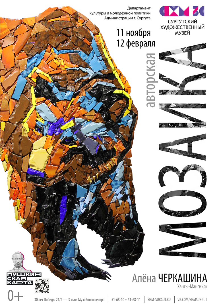 Персональная выставка авторской мозаики Алёны Черкашиной /Ханты-Мансийск/. В экспозиции представлено более 30 работ, выполненных в смальте и мраморе. Это пейзажи, натюрморты, фантазийные и орнаментально-декоративные композиции. В произведениях художника - любовь к суровой северной природе, образы из путешествий на священные земли коренных народов Югры |
