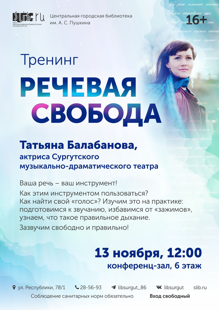 Тренинг по постановке речи. Ведущий - актриса Сургутского музыкально-драматического театра Татьяна Балабанова. Целевая аудитория – 16+ |