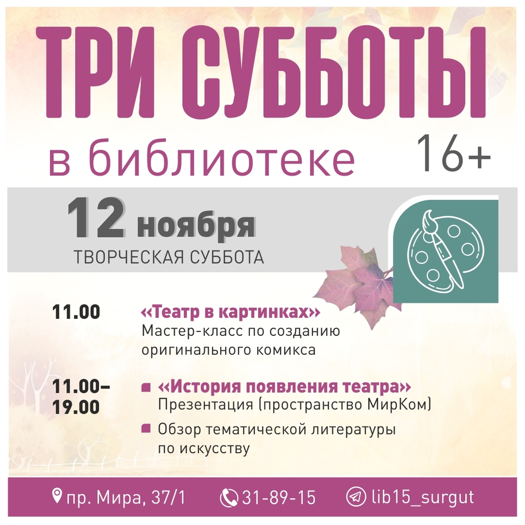 Мастер-класс по созданию оригинального комикса с помощью графического планшета. Обзор тематической литературы, презентация «История появления театра» К Неделе театра. Пространство МирКом В рамках Творческой субботы. Целевая аудитория – 16+ |