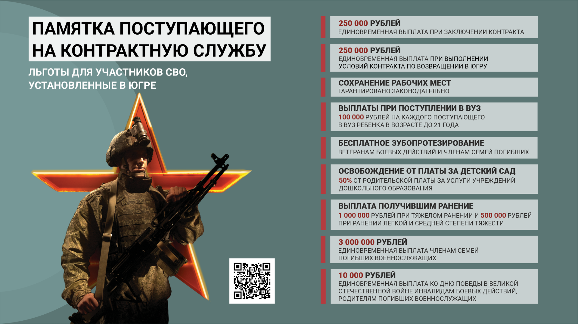 — Губернатором Югры приняты региональные льготы, их девять. Так, при заключении контракта предоставляется единовременная выплата — 250 тысяч рублей. Сохраняется рабочее место. После прохождения военной службы, при выполнении всех условий контракта, полагается единовременная выплата в размере еще 250 тысяч рублей.