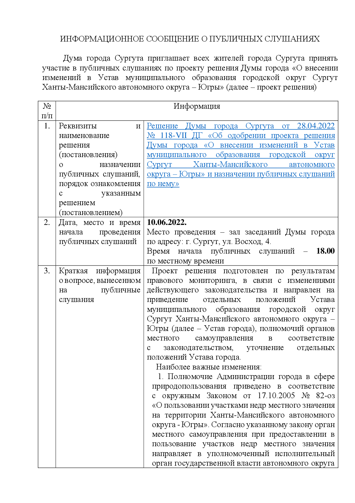 ИНФОРМАЦИОННОЕ СООБЩЕНИЕ О ПУБЛИЧНЫХ СЛУШАНИЯХ