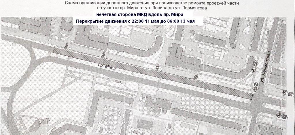 На период выполнения работ по ремонту асфальтобетонного покрытия будет производиться перекрытие движения автотранспорта на автомобильной дороге по проспекту Мира от перекрестка улицы Лермонтова с улицей проспект Мира до перекрестка с круговым движением улиц проспект Ленина – проспект Мира – улица Кукуевицкого: