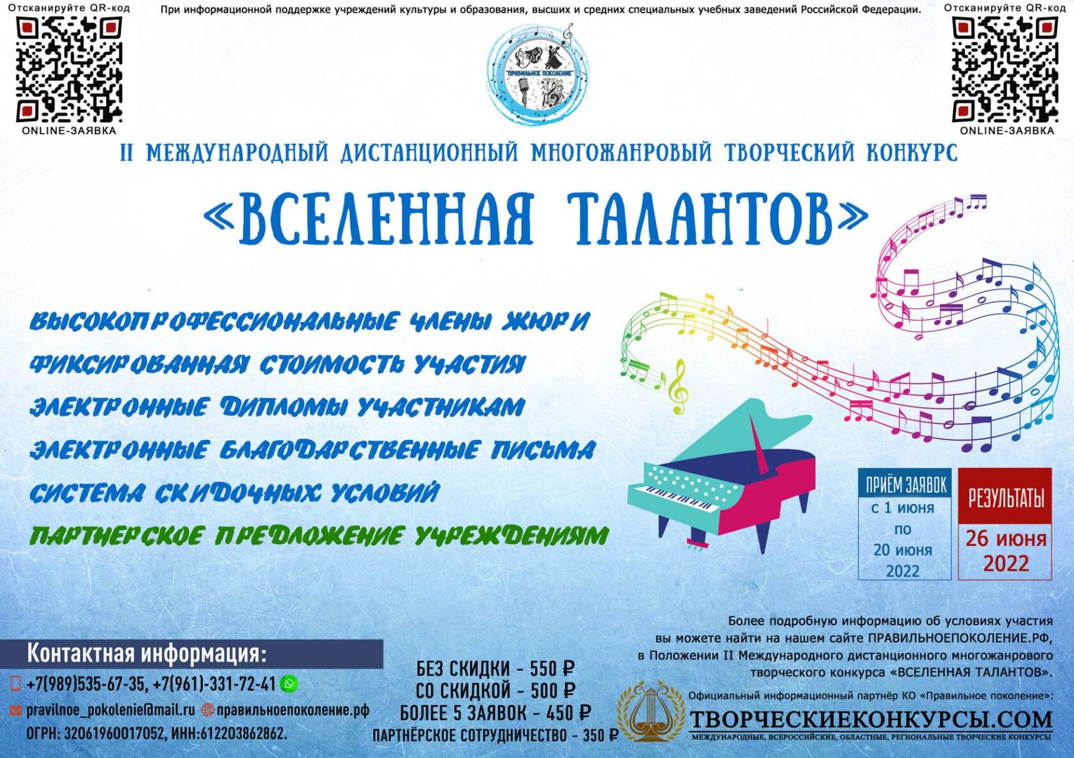 Прием заявок осуществляется с 1 по 20 июня. Оглашение результатов - 30 июня. Более подробная информация о конкурсе – в положении ниже. Форма заявки прикреплена во вложении. До встречи на Международном многожанровом творческом конкурсе «Вселенная талантов»!