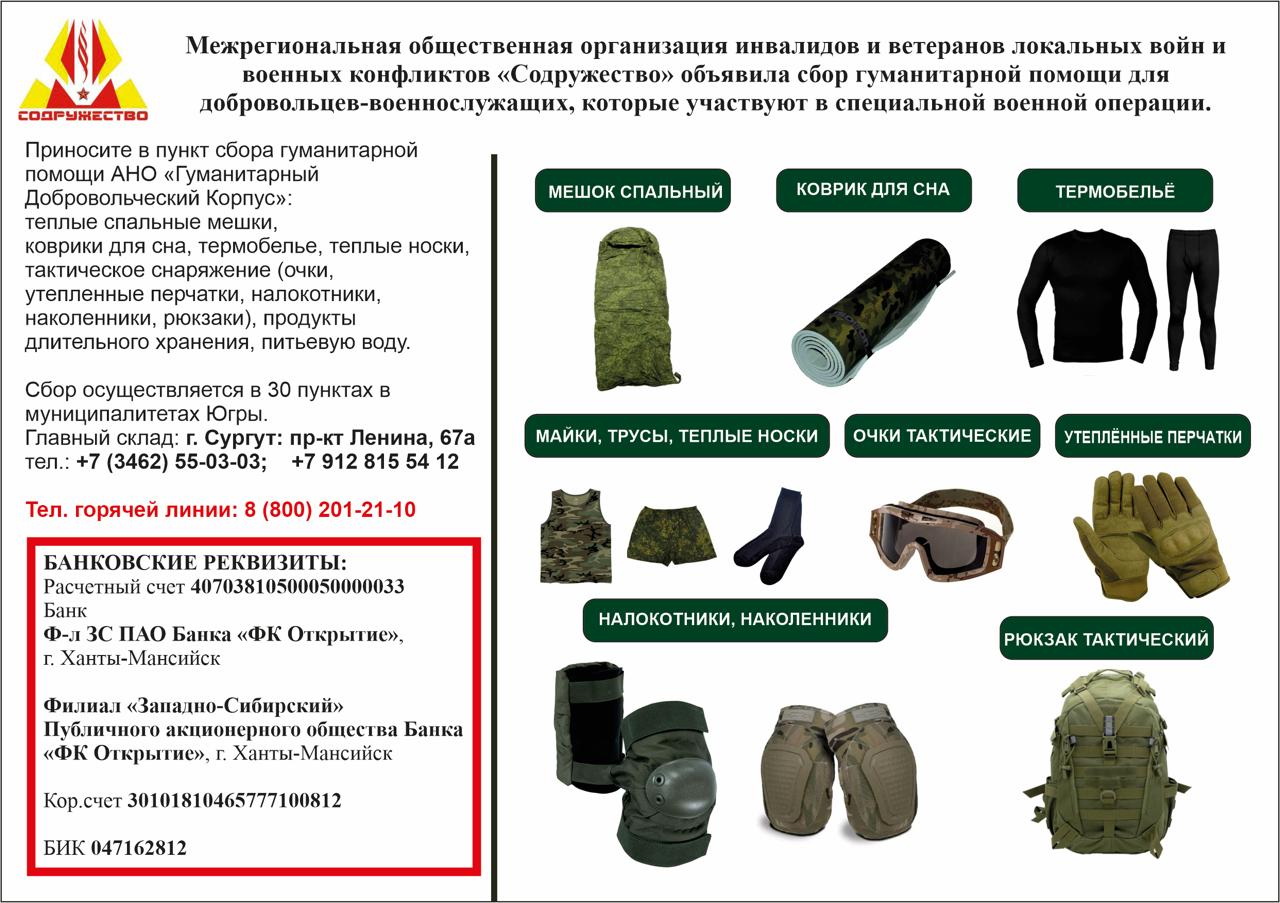 «Несомненно, мобилизованные граждане укомплектованы необходимым. Но в полевых условиях им требуется запас. Поэтому мы собираем теплые спальные мешки, коврики для сна, термобелье, теплые носки, тактическое снаряжение (очки, утепленные перчатки, налокотники, наколенники, рюкзаки), продукты длительного хранения, питьевую воду. Мы принимаем все, что может потребоваться дополнительно в полевых условиях, в том числе средства личной гигиены, продукты питания длительного хранения, питьевую воду. «Содружество» также производит сбор денежных средств для приобретения экипировки и тактического снаряжения», – рассказывает заместитель председателя межрегиональной общественной организации инвалидов и ветеранов локальных войн и военных конфликтов «Содружество» Михаил Севостьянов