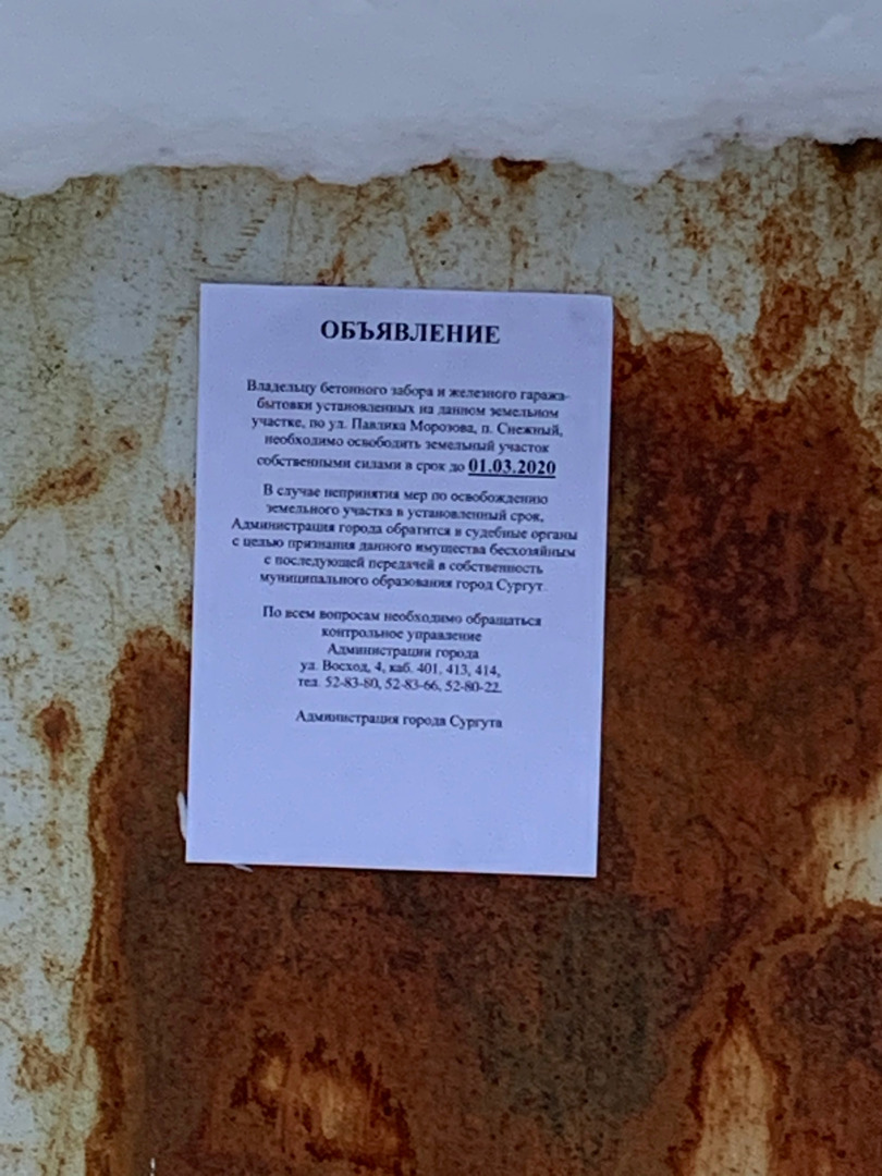 Владельцу бетонного забора и железного гаража-бытовки установленных на данном земельном участке, по ул. Павлика Морозова, п. Снежный, необходимо освободить земельный участок собственными силами в срок до 01.03.2020
