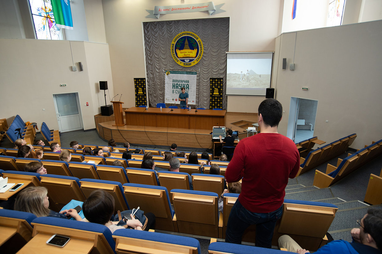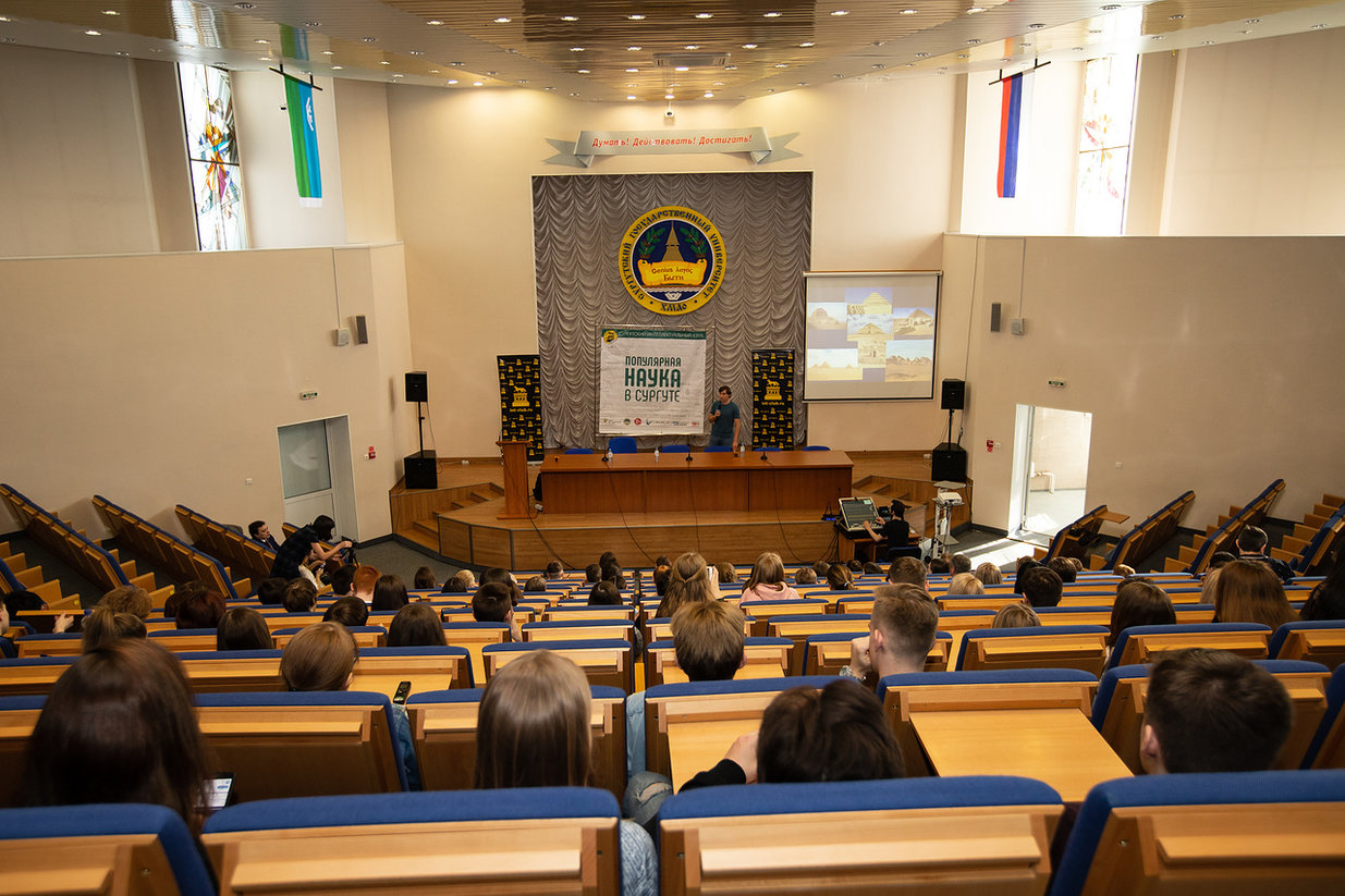 21 апреля 2018 года в актовом зале гуманитарного корпуса Сургутского государственного университета состоялась научно-популярная лекция Максима Лебедева, кандидата исторических наук, старшего научного сотрудника Института востоковедения РАН, египтолога, многолетнего участника археологических экспедиций в Египте и Судане, автора книги «Слуги фараона вдали от Нила», участника «Ученые против мифов» на темы: «ГИГАНТЫ ГИЗЫ: как они это сделали?» и «Пирамиды над раскопом: как работается в Египте российским археологам?»