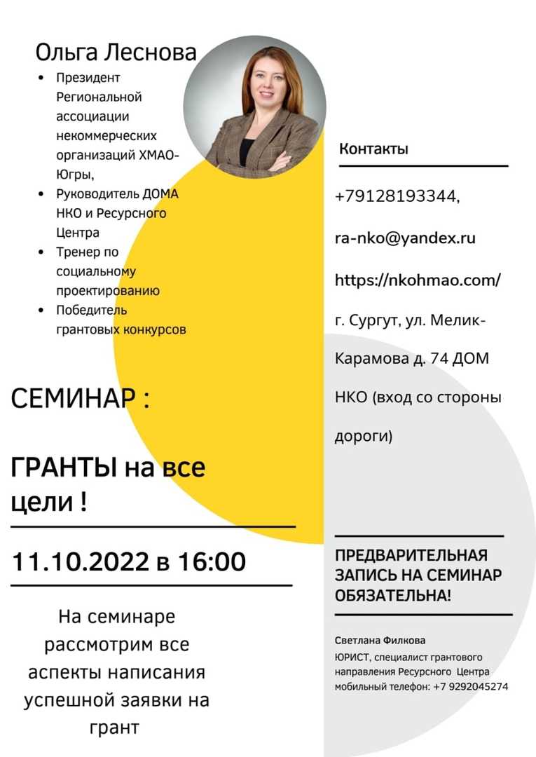 11 октября 2022 года в 16.00 часов в рамках реализации гранта Губернатора Югры пройдет обучающий семинар на тему: «Гранты на все цели!». На семинаре будут рассмотрены все аспекты написания успешной заявки на грант. Семинар будет проходить по адресу: г. Сургут, ул. Мелик-Карамова, д. 74, ДОМ НКО (вход со стороны дороги). Предварительная запись на семинар обязательна!