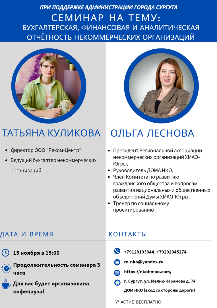 15 ноября 2022 года в 15.00 часов при поддержке Администрации города пройдет обучающий семинар на тему: «Бухгалтерская, финансовая и аналитическая отчетность некоммерческих организаций». Продолжительность семинара 3 часа, для вас будет организована кофе-пауза. Участие в семинаре бесплатное! Адрес проведения семинара: г. Сургут, ул. Мелик-Карамова, д. 74 ДОМ НКО (вход со стороны дороги), контактные телефоны: +79128193344; +79292045274.