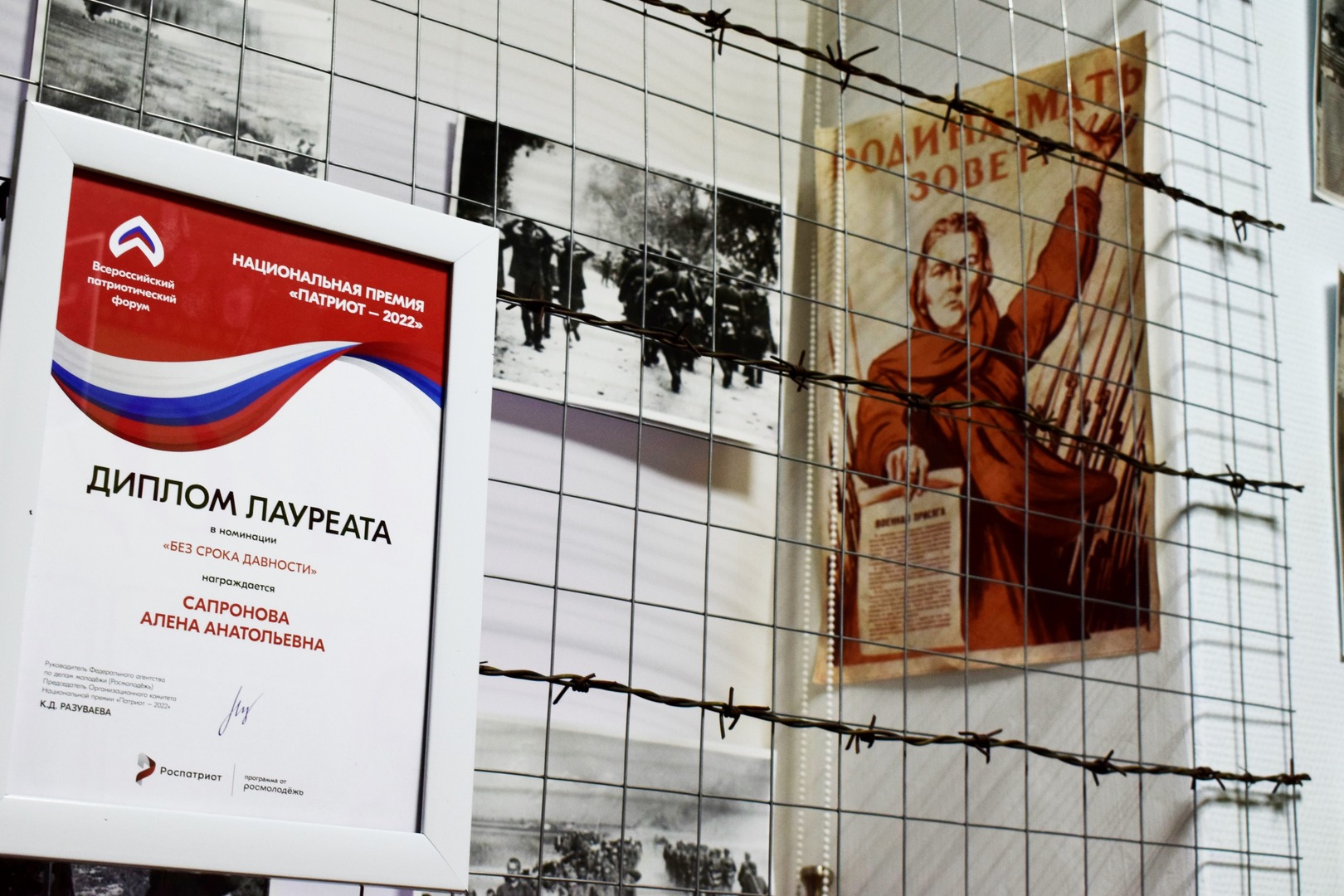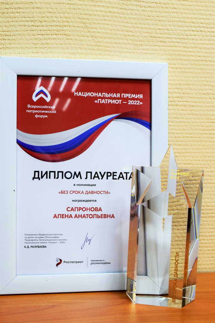 В номинации «Без срока давности» лауреатом Национальной премии стала Сапронова Алёна Анатольевна, начальник центра патриотического воспитания «Саланг» МБУ «ЦСП «Сибирский легион» с проектом «Стационарная выставка «Без срока давности».