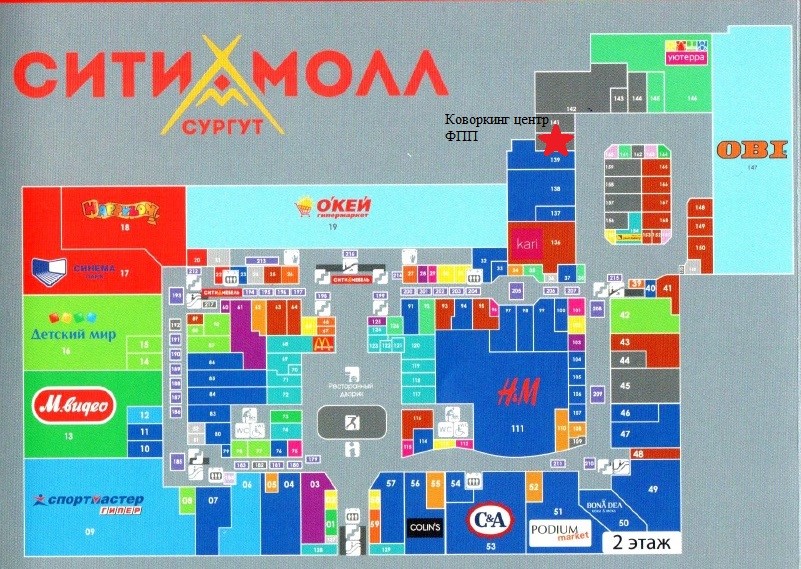 Схема расположения коворкинг центра ФПП в ТРЦ Сургут Сити Молл.