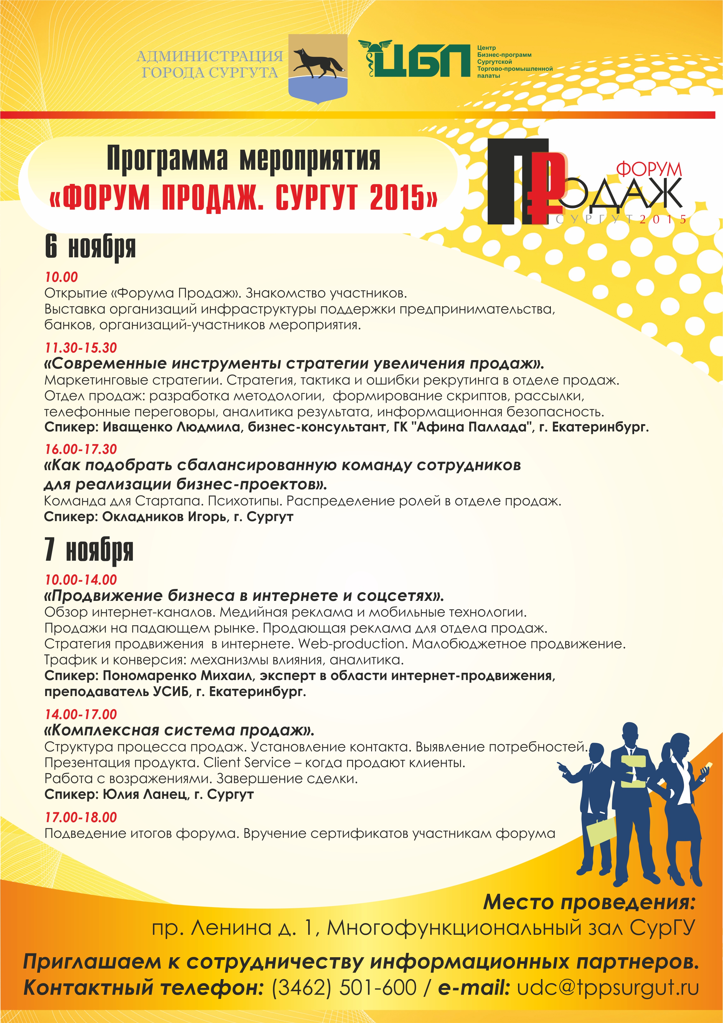 В рамках реализации подпрограммы «Развитие малого и среднего предпринимательства» ООО «Центр Бизнес-Программ Сургутской торгово-промышленной палаты» при поддержке Администрации города Сургута 6-7 ноября 2015 года проводит мероприятие «ФОРУМ ПРОДАЖ. Сургут 2015».