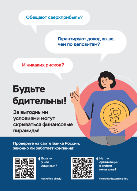 Банк России предупреждает: Будьте бдительны! За супервыгодными условиями может скрываться финансовая пирамида или нелегальная компания