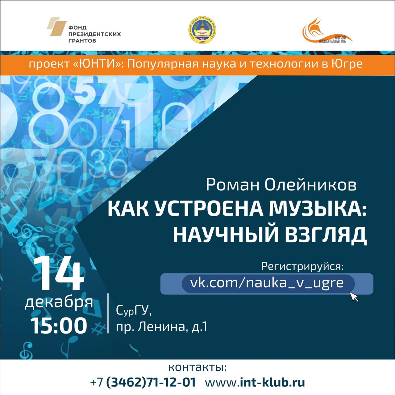 14 декабря 2019 года в Сургуте пройдет необычная научно-популярная лекция на стыке искусства и математики: «Как устроена музыка. Научный взгляд». Ее прочитает научный сотрудник Института машиноведения РАН, автор книги «Построение музыкальных систем», имеющий два высших образования: математика МИФИ и режиссера во ВГИК – Роман Олейников.