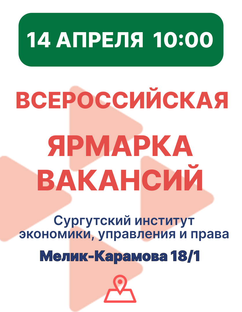 14.04.2023 года в 10-00 час. в городе Сургуте в здании АНПЭОО «Сургутский институт экономики, управления и права» (ул. Мелик-Карамова д. 18/1, 1 этаж) состоится Всероссийская ярмарка трудоустройства «Работа России. Время возможностей».