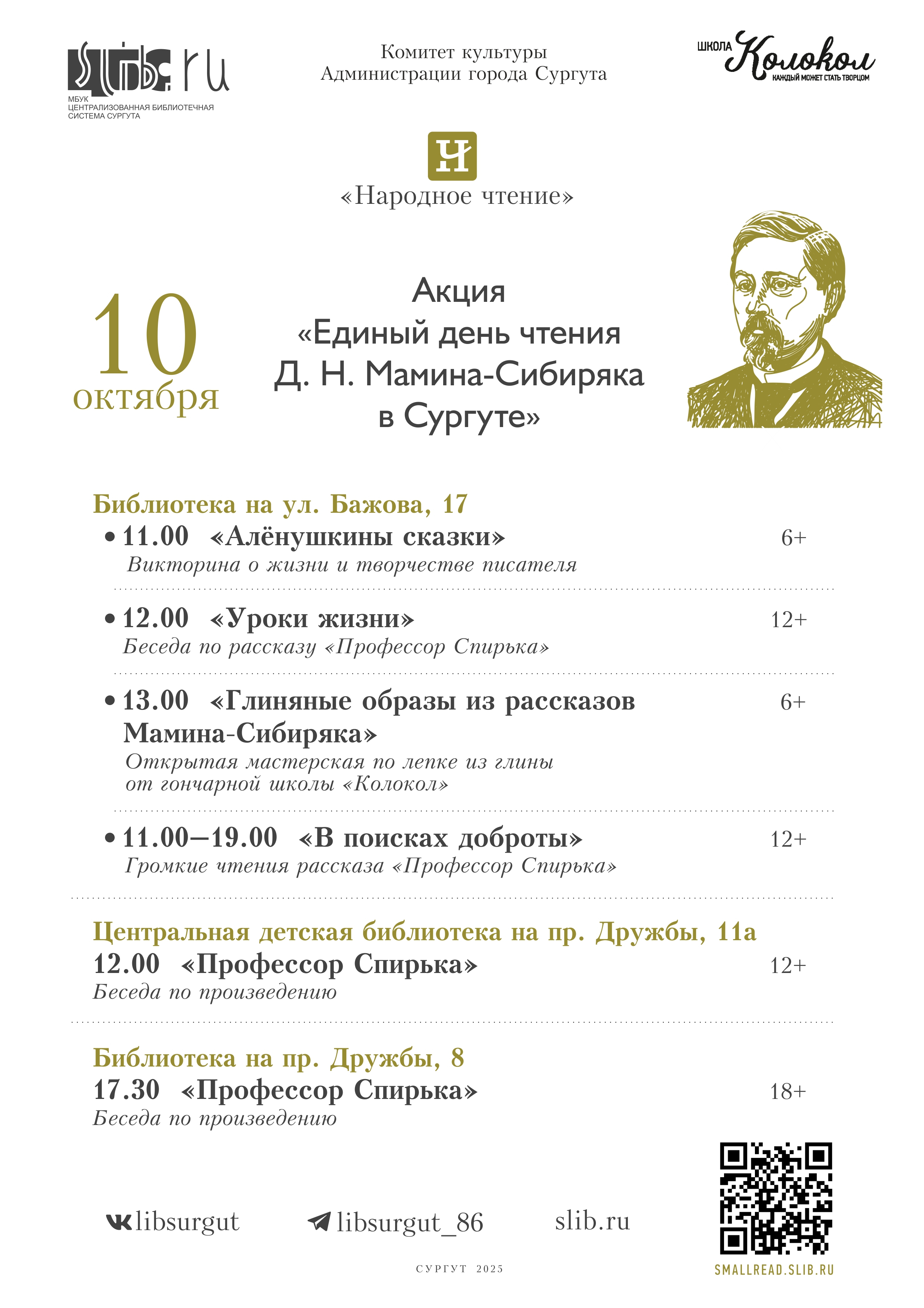 10 октября 2025 года в рамках четвертого этапа проекта «Народное чтение» в сургутских библиотеках пройдет «Единый день чтения в Сургуте», посвященный творчеству русского писателя Д. Н. Мамина-Сибиряка.