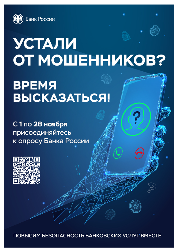 Опрос проводится на официальном сайте Банка России, является анонимным и может быть пройден с любого устройства, имеющего доступ к сети Интернет, в период с 01 ноября по 28 ноября 2025 года по ссылке или QR-коду: