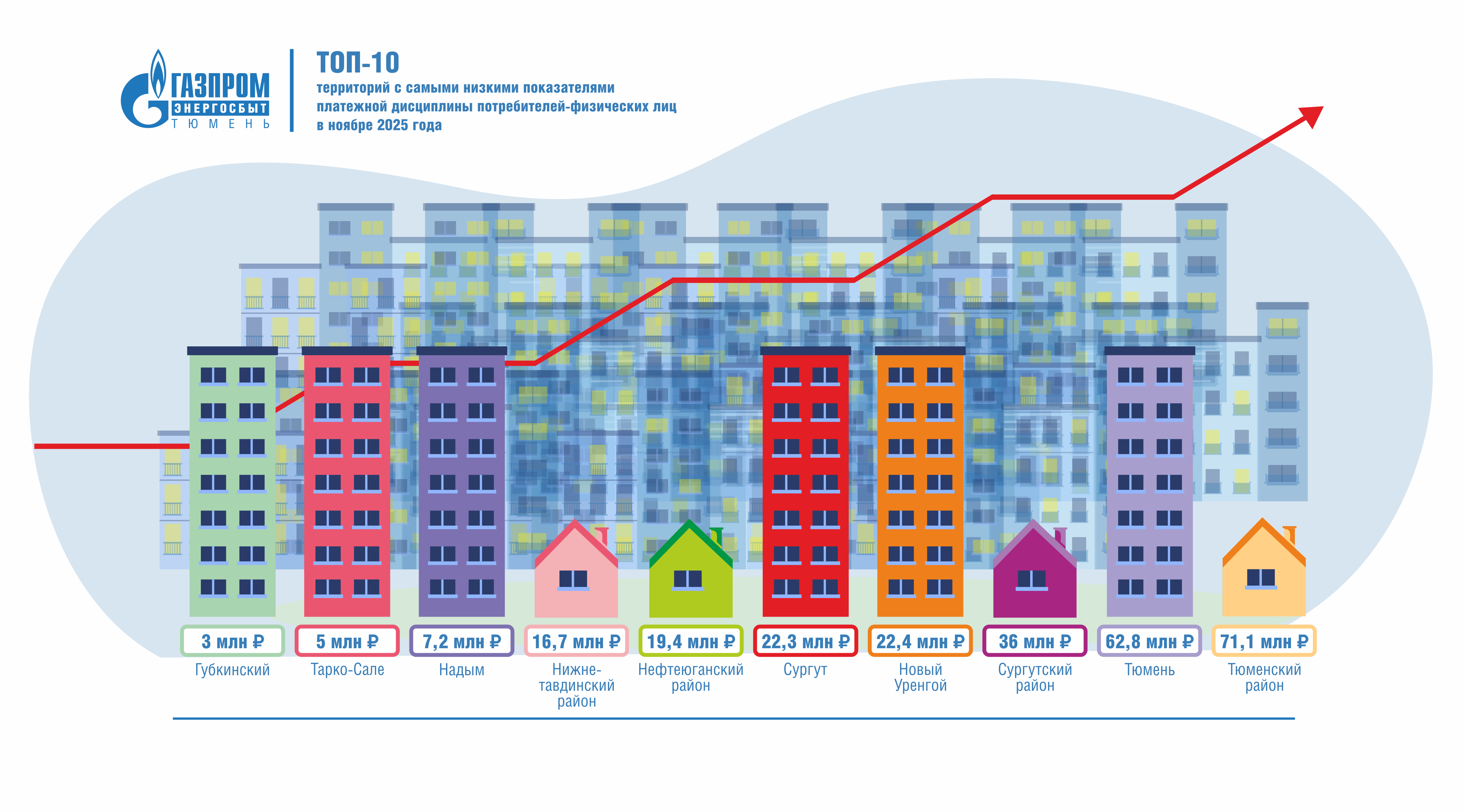АО «Газпром энергосбыт Тюмень» оценило просроченную дебиторскую задолженность бытовых потребителей за электроэнергию. Общий долг жителей трех субъектов РФ перед гарантирующим поставщиком электроэнергии за год вырос почти на 15 млн и к середине ноября 2025 года достиг 393,7 млн рублей. В Ханты-Мансийском автономном округе-Югре сумма задолженности физических лиц составляет более 157,3 млн руб., в Ямало-Ненецком автономном округе – 45,5 млн руб., в Тюменской области – около 190 млн руб.