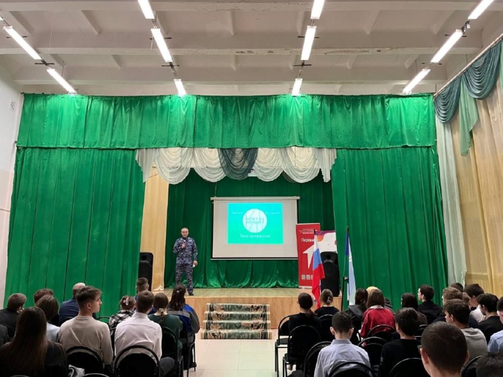 В школе имени Героя Советского Союза Гавриила Собянина начальник пункта централизованного наблюдения Росгвардии майор полиции Станислав Рукалеев встретился с воспитанниками детско-юношеского военно-патриотического общественного движения «ЮНАРМИЯ» и первичного отделения «Движения Первых» и рассказал ребятам о Героях специальной военной операции, об особенностях службы в Росгвардии, истории образования подразделения вневедомственной охраны в Игриме. Подростки, которые мечтают об офицерской карьере, узнали об условиях поступления в вузы ведомства.