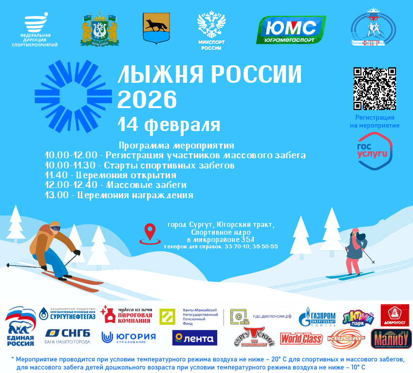 14 февраля 2026 года на спортивном объекте «Спортивное ядро в микрорайоне 35А» (Югорский тракт), будет проходить традиционная городская лыжная гонка «Сургутская лыжня – 2026» в рамках XLIV Всероссийской массовой лыжной гонки «Лыжня России – 2026».