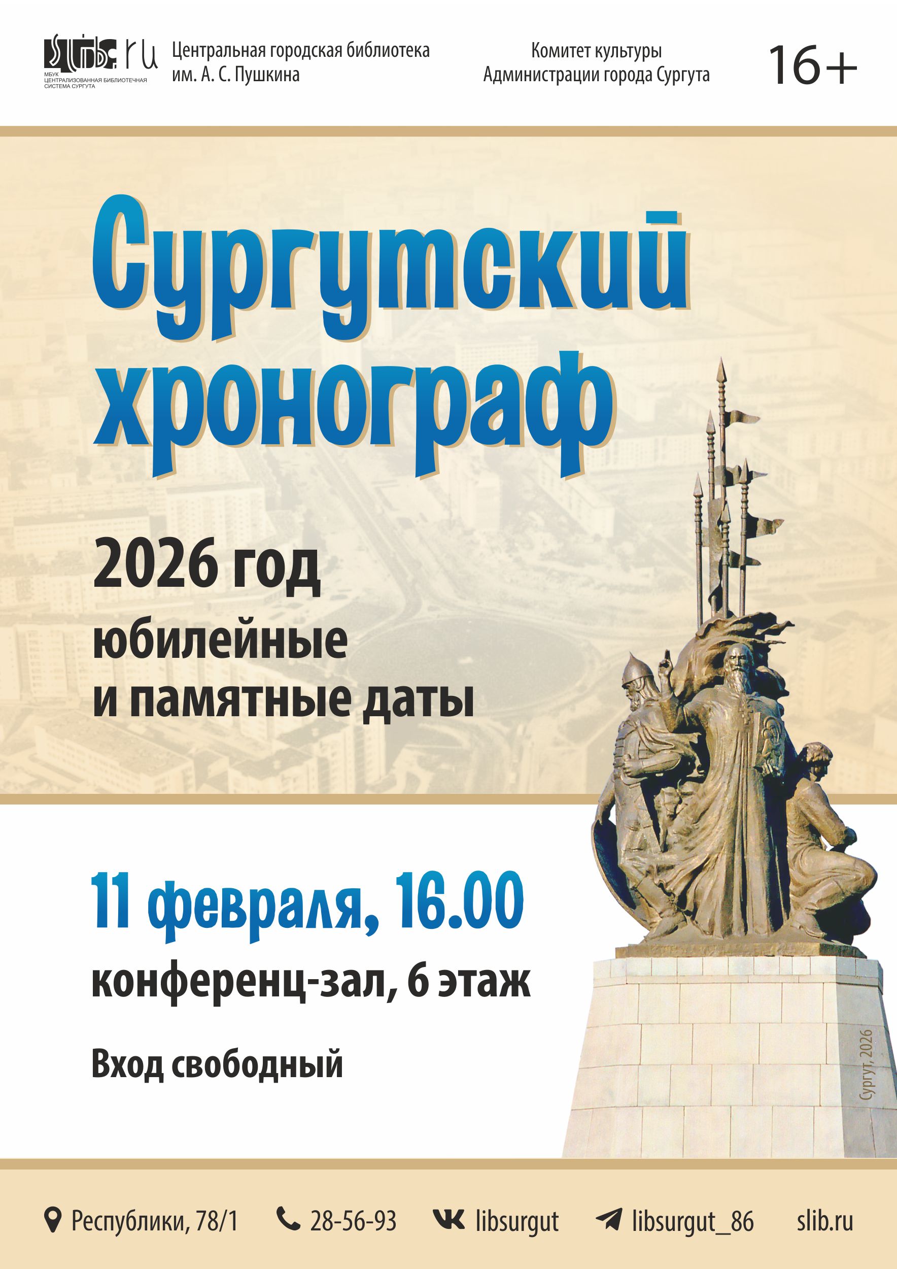 В Центральной городской библиотеке им. А. С. Пушкина 11 февраля, в 16.00 часов состоится встреча «Сургутский хронограф», посвященная знаменательным и памятным датам 2026 года.