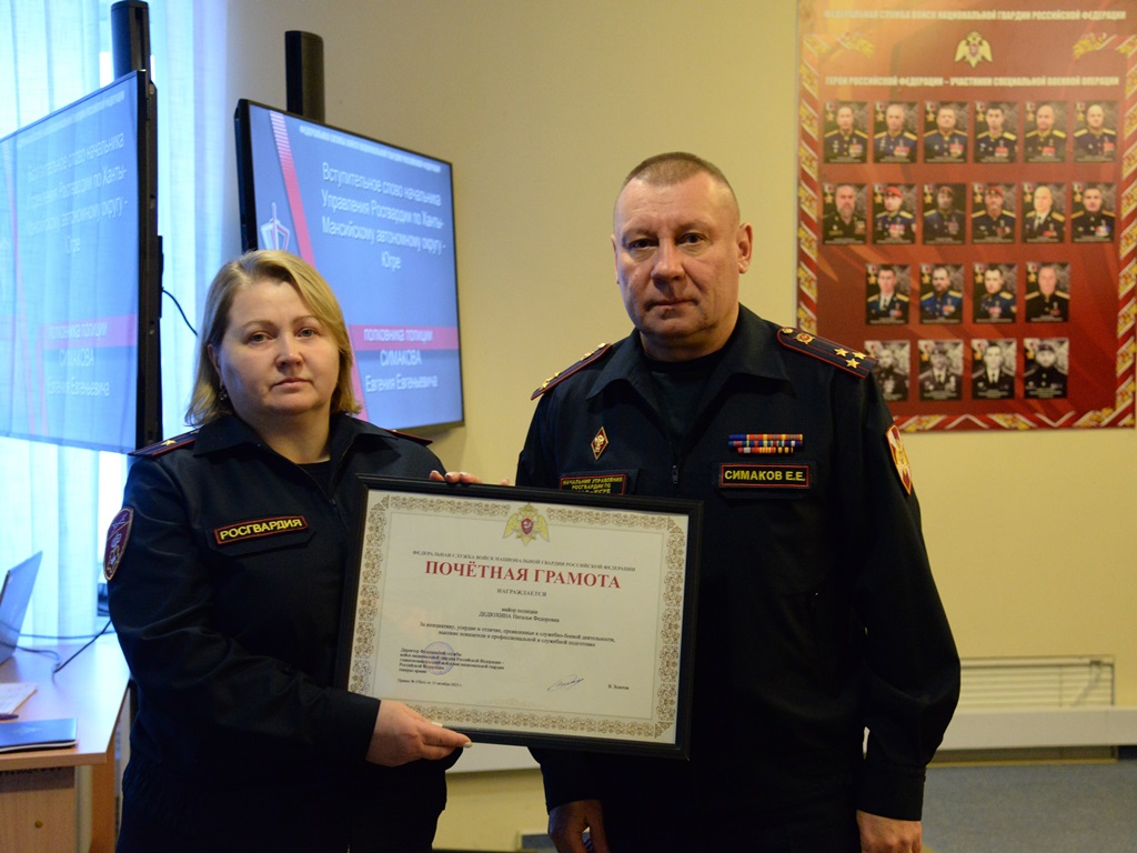 В завершение мероприятия начальник теруправления Росгвардии по ХМАО – Югре полковник полиции Евгений Симаков  поблагодарил личный состав за добросовестное исполнение служебных обязанностей, а также поздравил руководителей филиалов, достигших наиболее высоких показателей деятельности по итогам 2025 года.
