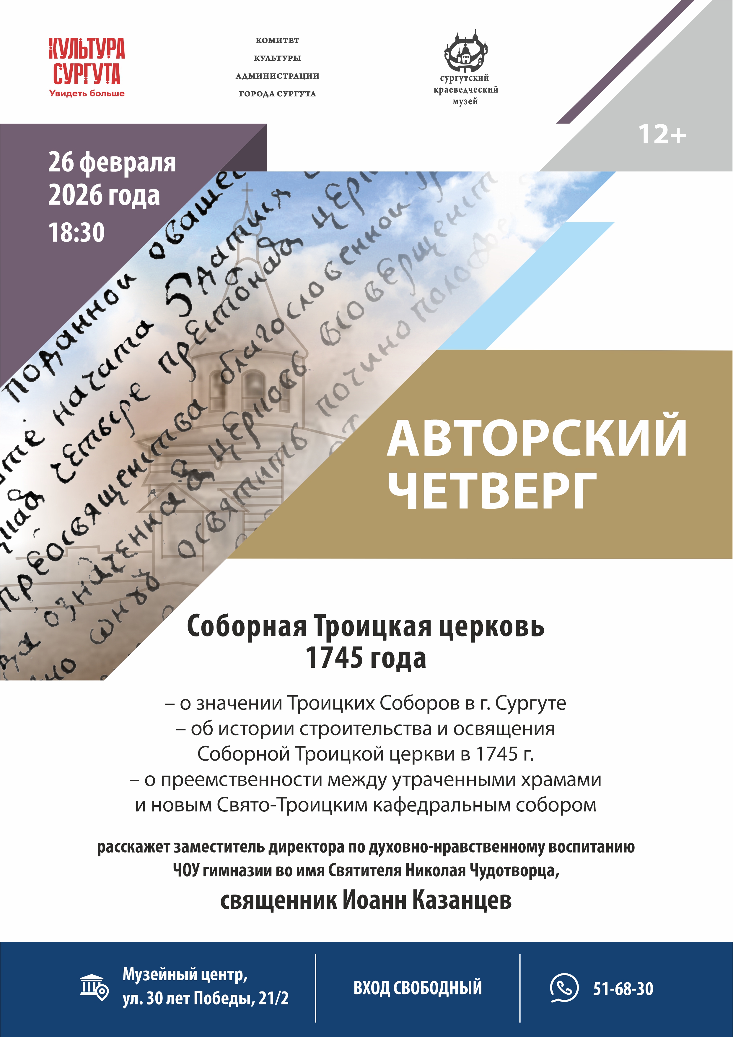 26 февраля в 18.30 в Сургутском краеведческом музее в рамках просветительского проекта «Авторский четверг» пройдет лекция «Соборная Троицкая церковь 1745 года».
