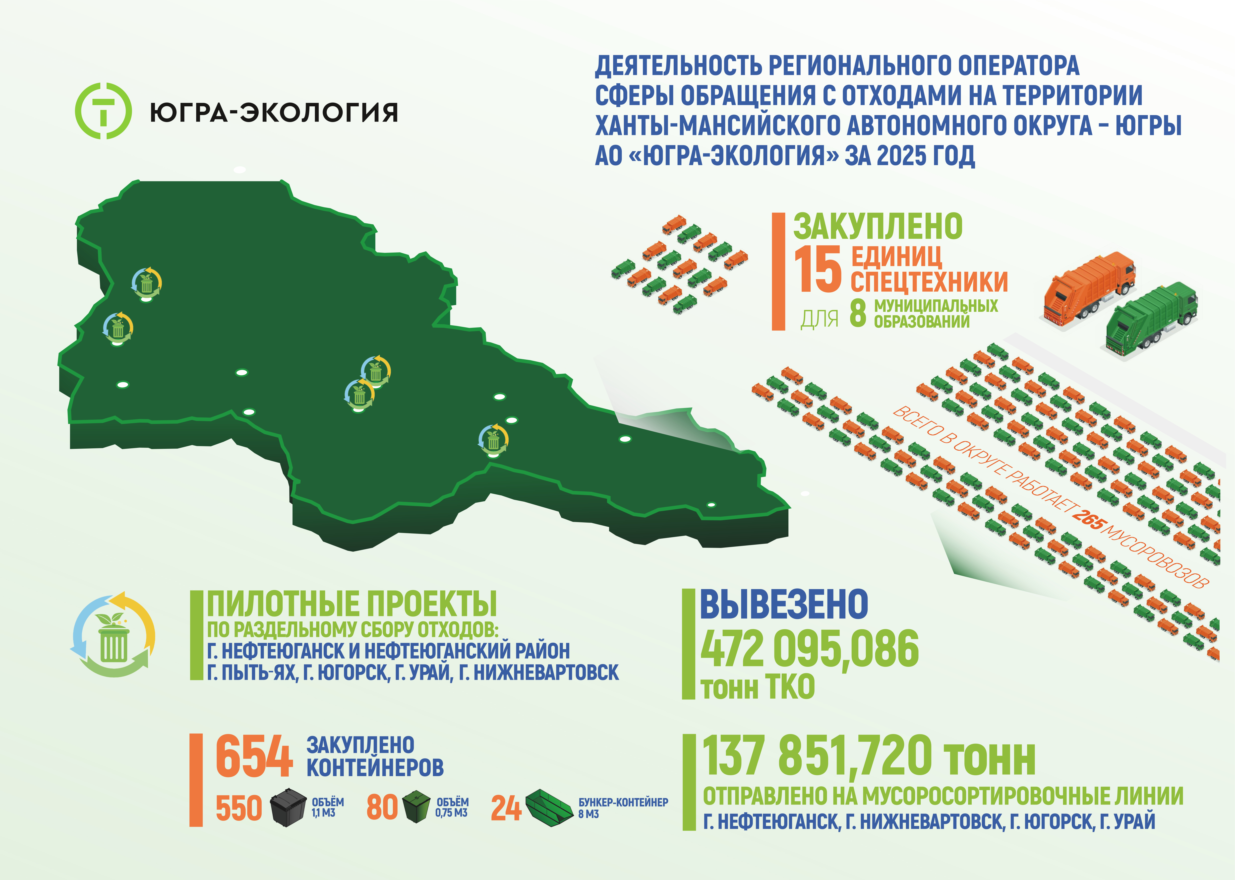 В конце 25-го года, благодаря программе льготного лизинга, разработанной Российским экологическим оператором и Минприроды России, в Югре закуплено 15 новых мусоровозов. Города, в которых работает новая техника: Нижневартовск, Лангепас, Сургут, Когалым, Лянтор, Урай, Нягань, Березовский район.