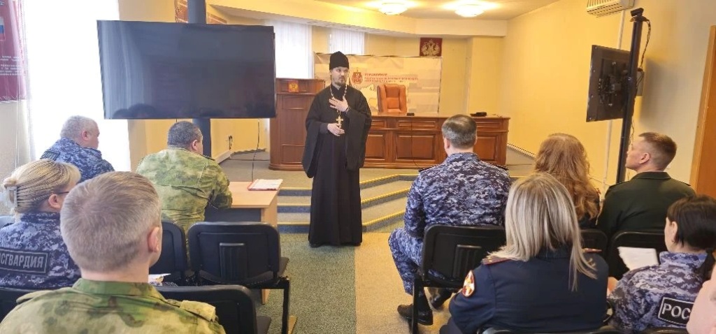 А накануне иерей Евгений Кизин провел просветительскую беседу   с личным составом теруправления Росгвардии об истории и традициях важного христианского праздника Пасхи.